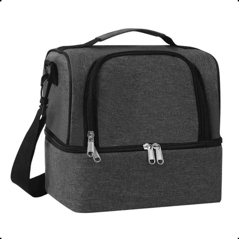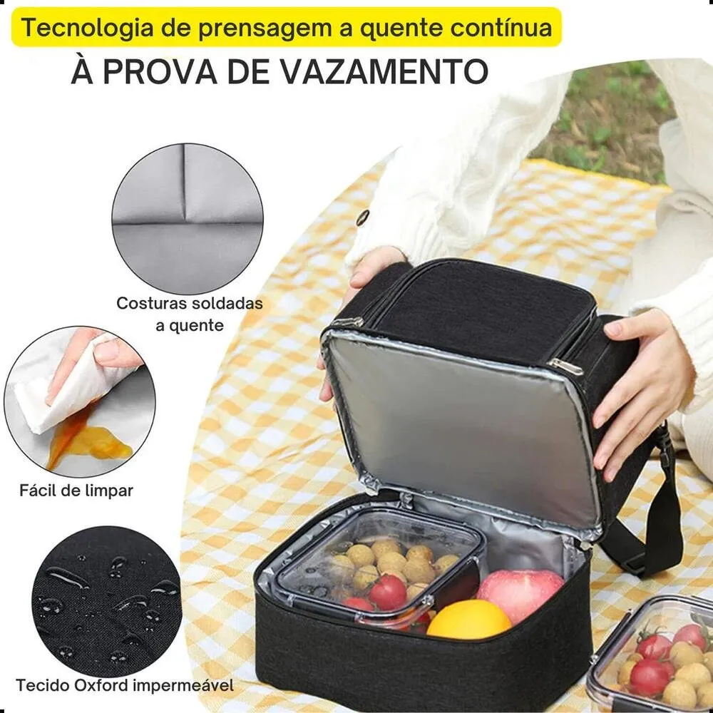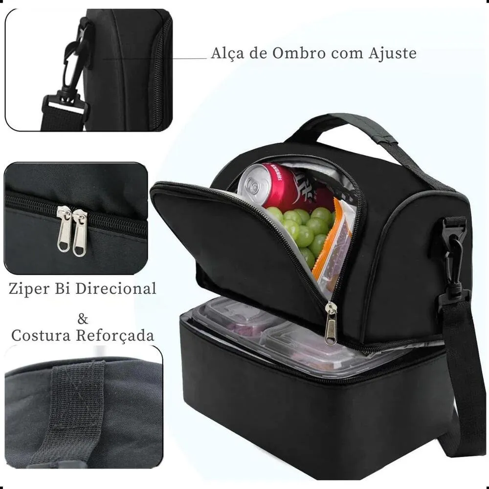 Seu design inteligente conta com duas repartições independentes, permitindo separar alimentos e bebidas de forma organizada. O compartimento inferior oferece espaço adequado para marmitas e recipientes, enquanto o compartimento superior é ideal para itens menores ou alimentos que precisam de maior conservação térmica.