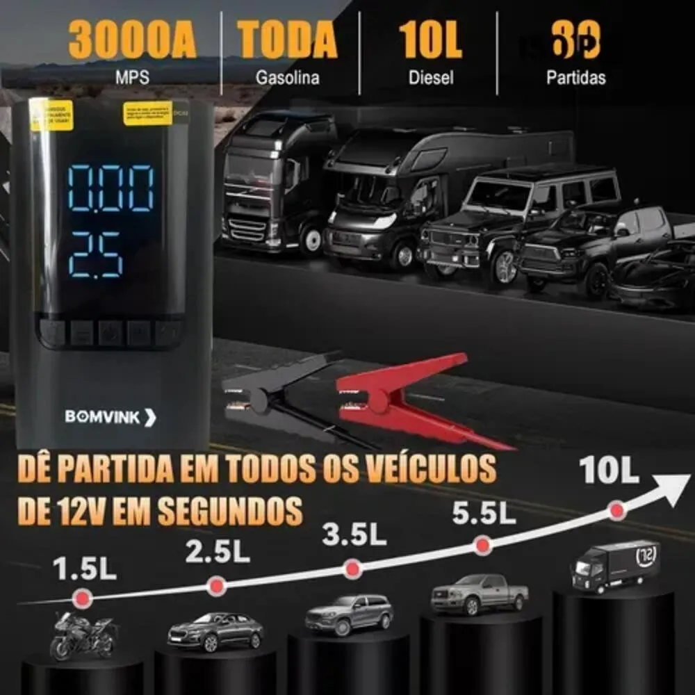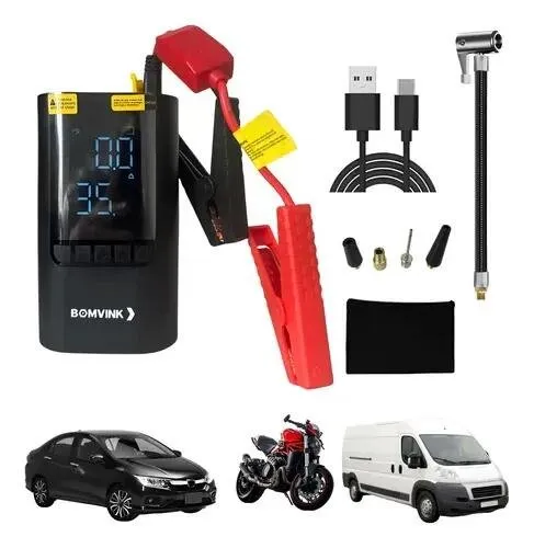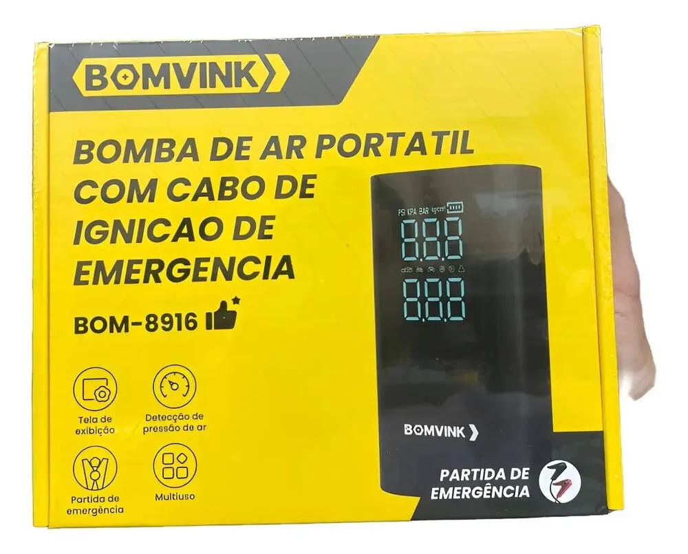 Além da função de bomba de ar, o modelo conta com cabo de ignição de emergência, possibilitando auxiliar na partida do veículo em situações de bateria descarregada. Essa combinação torna o equipamento versátil e indispensável para quem busca mais segurança e autonomia.