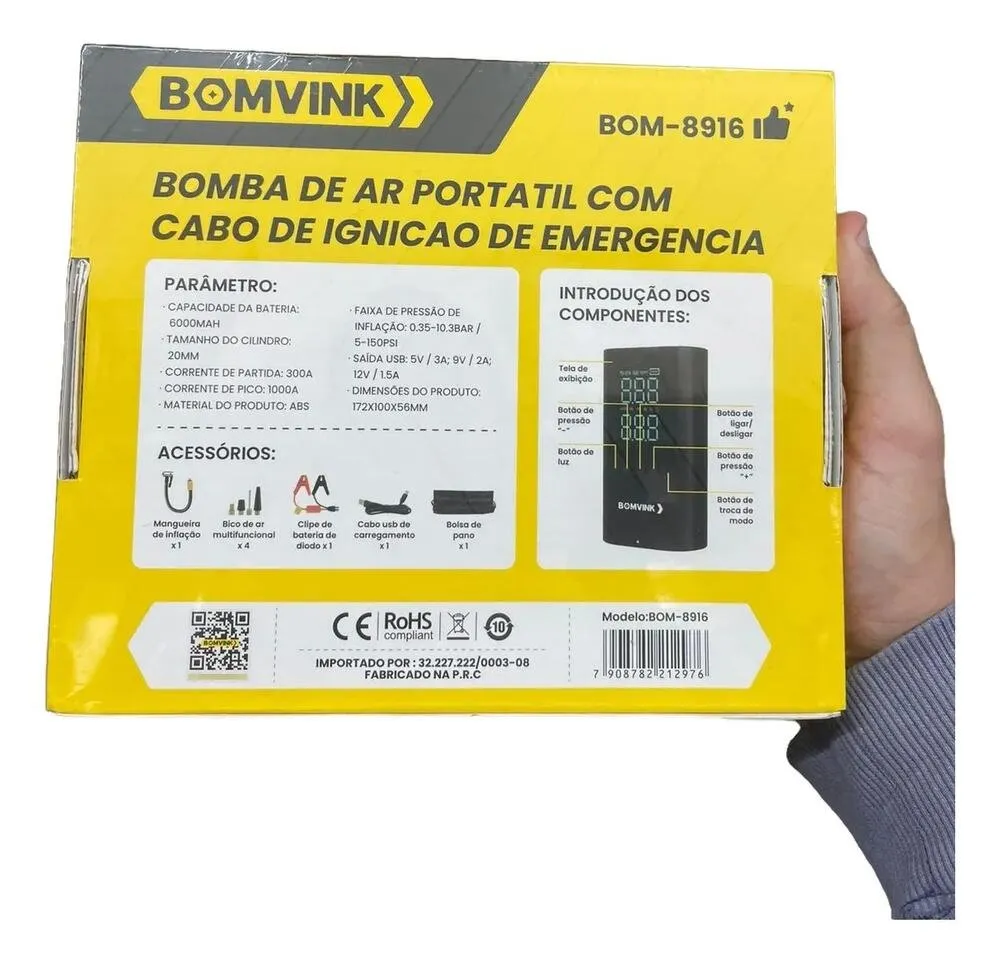 A Bomba de Ar Portátil Bomvink BOM-8916 foi desenvolvida para oferecer suporte em situações de emergência e manutenção básica de veículos. Compacta e fácil de transportar, ela permite inflar pneus de forma prática, sendo uma excelente aliada para motoristas no dia a dia ou em viagens.