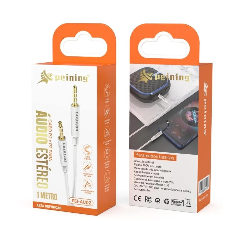 Cabo de áudio desenvolvido para conexão entre dispositivos eletrônicos compatíveis que utilizam conector P2 (3,5 mm) em ambas as extremidades, permitindo a transmissão de sinal de áudio por meio de ligação física.