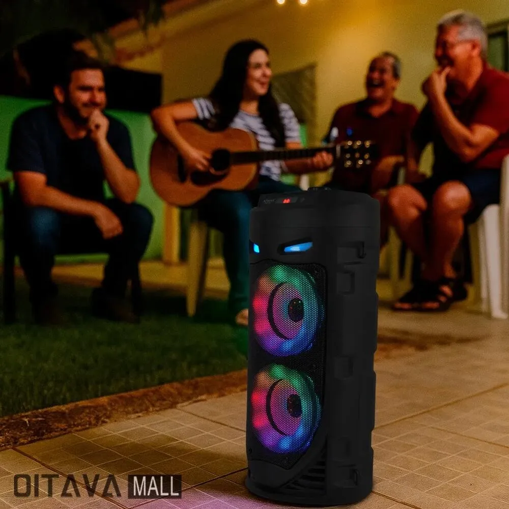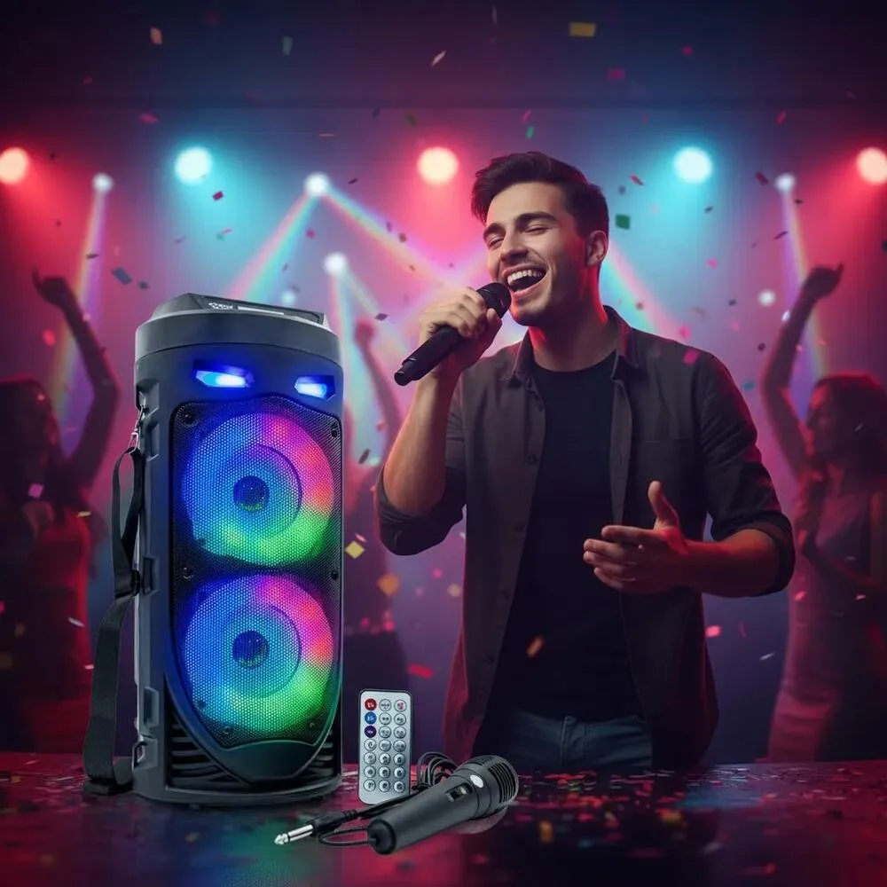 Seu design moderno e portátil facilita o transporte, sendo ideal para festas, reuniões, eventos ou uso doméstico.