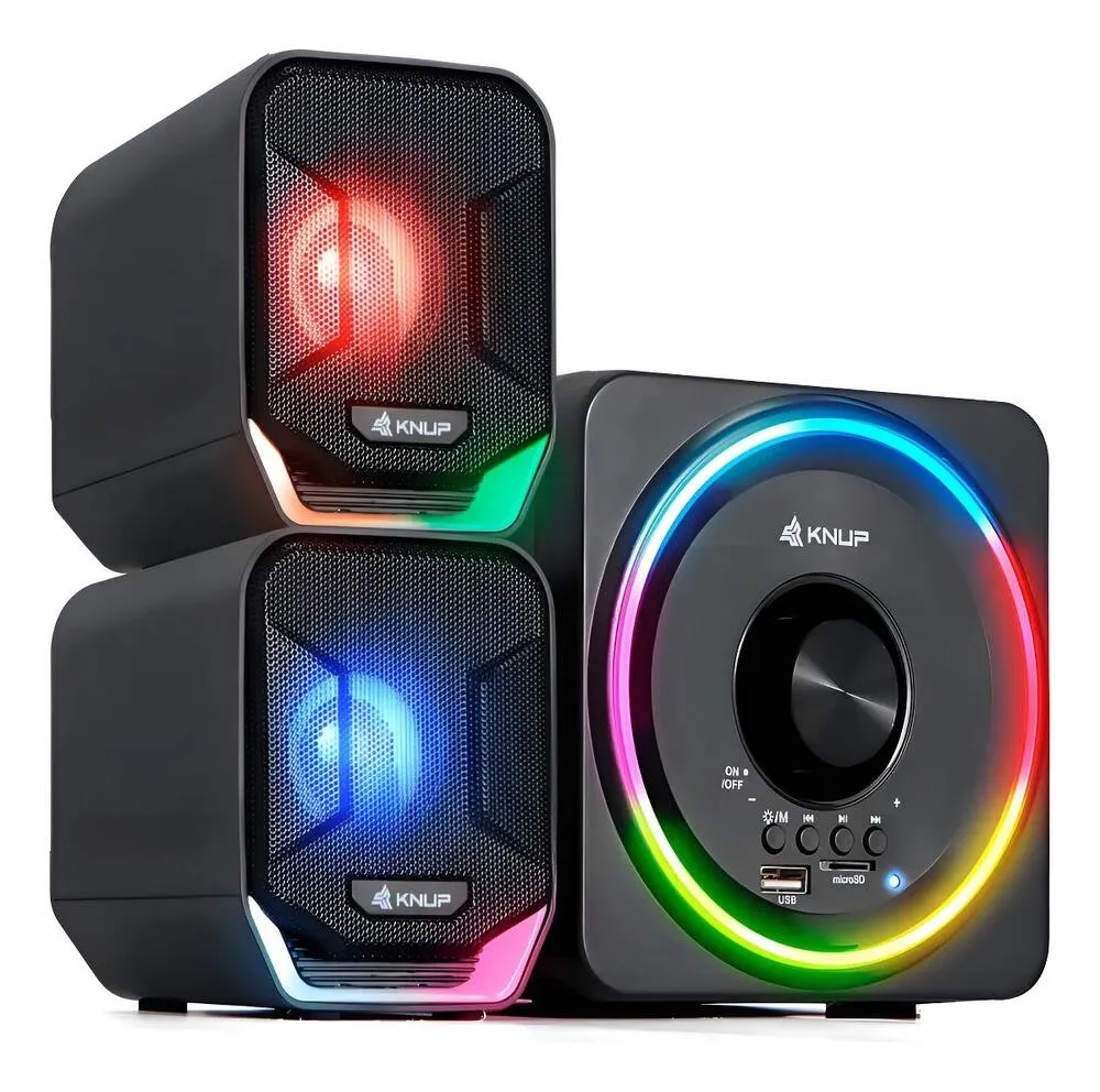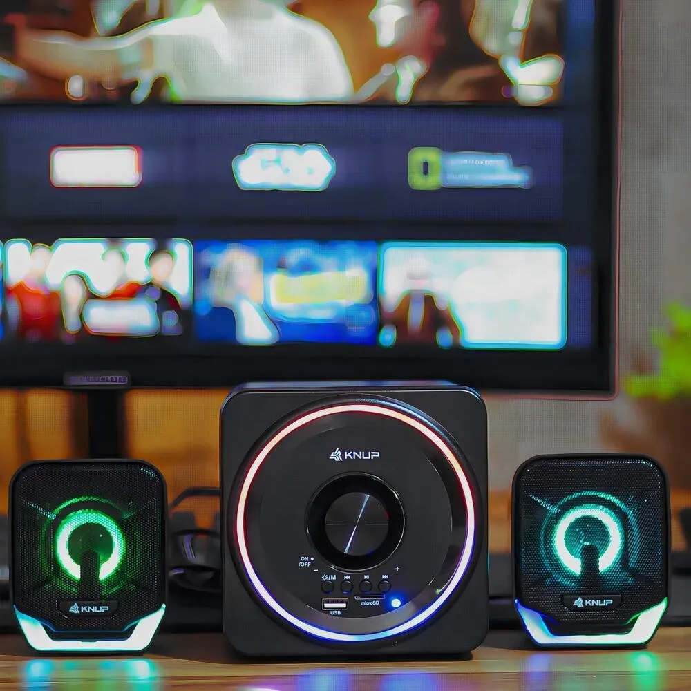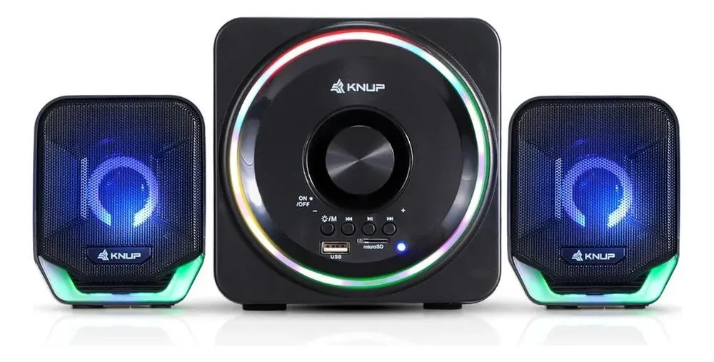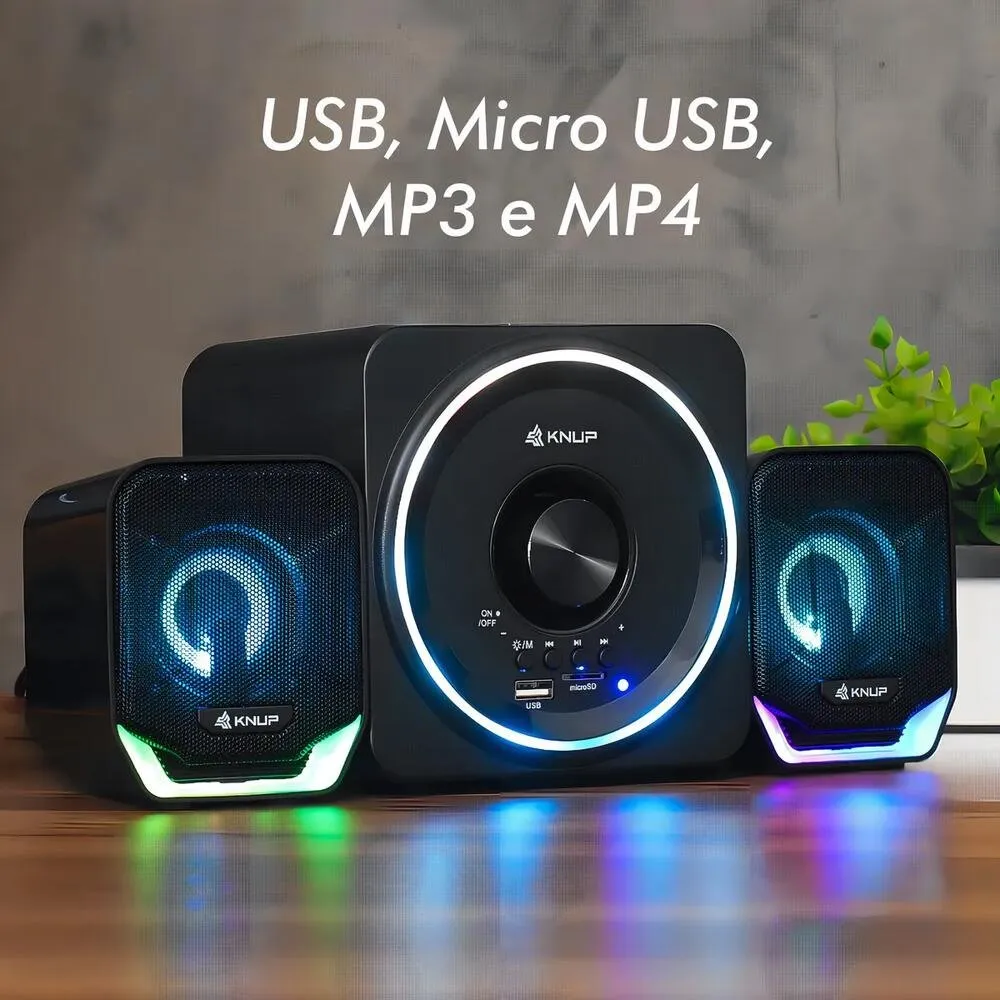 Este sistema versátil possui conectividade Bluetooth, permitindo transmissão de áudio sem fio para smartphones e tablets, além de entradas USB para pen drive, slot para cartão MicroSD e entrada P2 de 3,5 mm para conexão com PCs e notebooks. A iluminação LED RGB integrada adiciona estilo e efeito visual ao setup gamer ou de entretenimento.