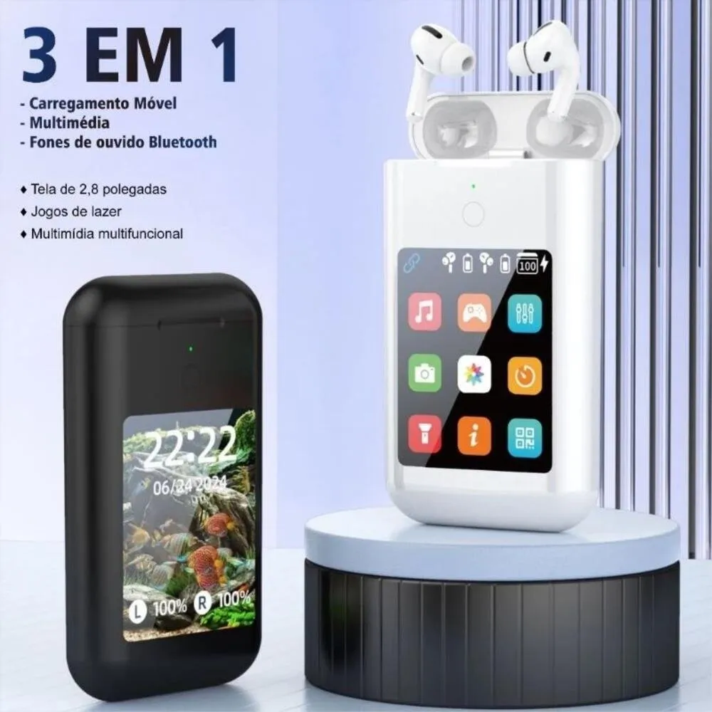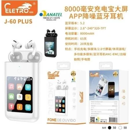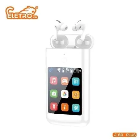 O Fone de Ouvido Bluetooth TWS J60 Plus combina tecnologia de áudio moderna com um estojo inteligente multifuncional com tela touch LCD de 2.8 polegadas.