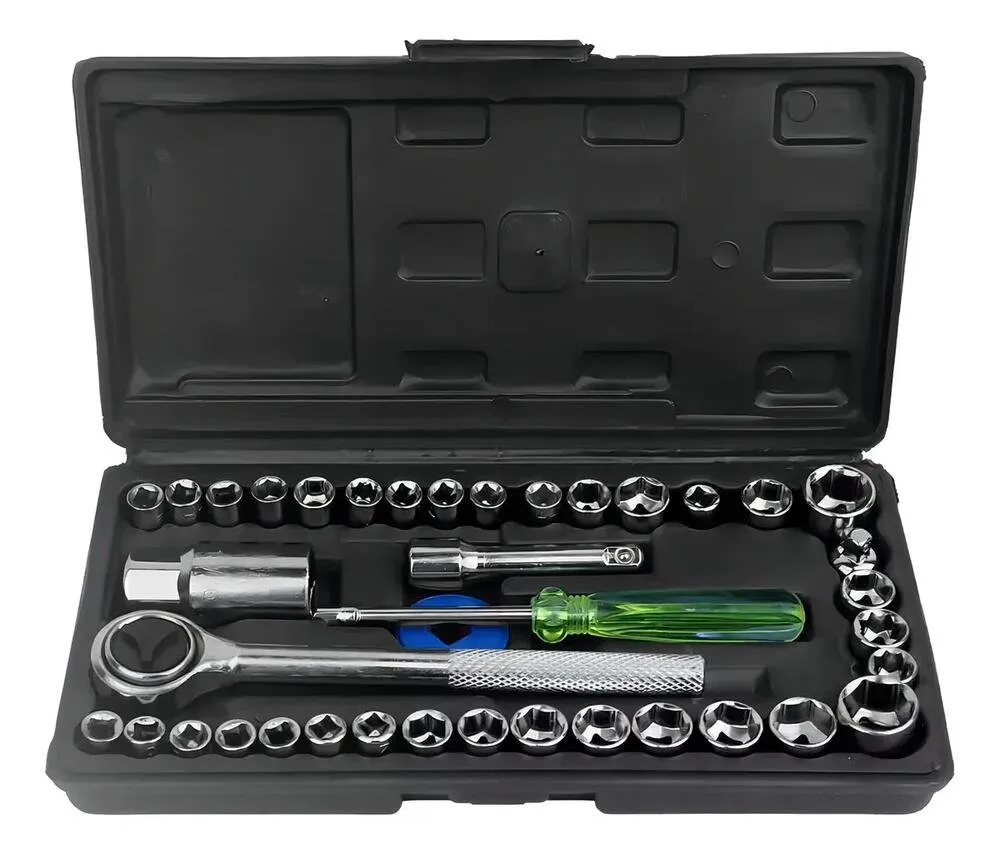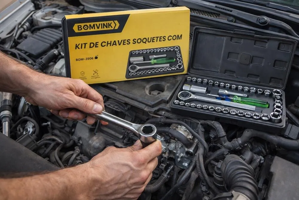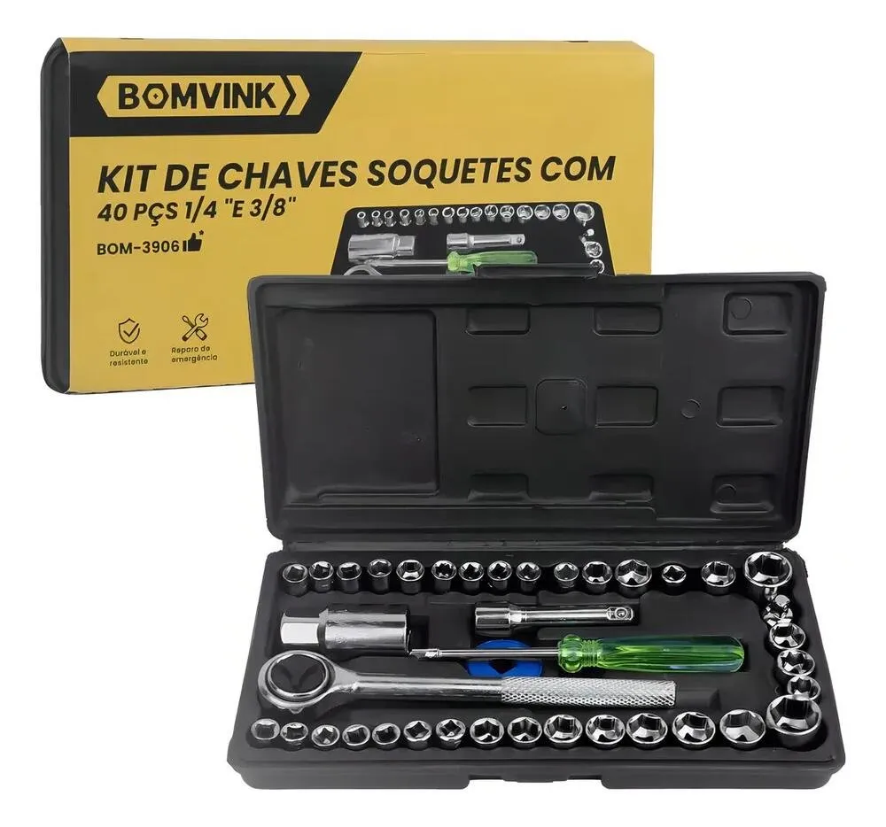 O Kit de Chaves Soquetes Bomvink BOM-3906 é um conjunto completo com 40 peças, ideal para manutenção automotiva, reparos domésticos e trabalhos mecânicos em geral.