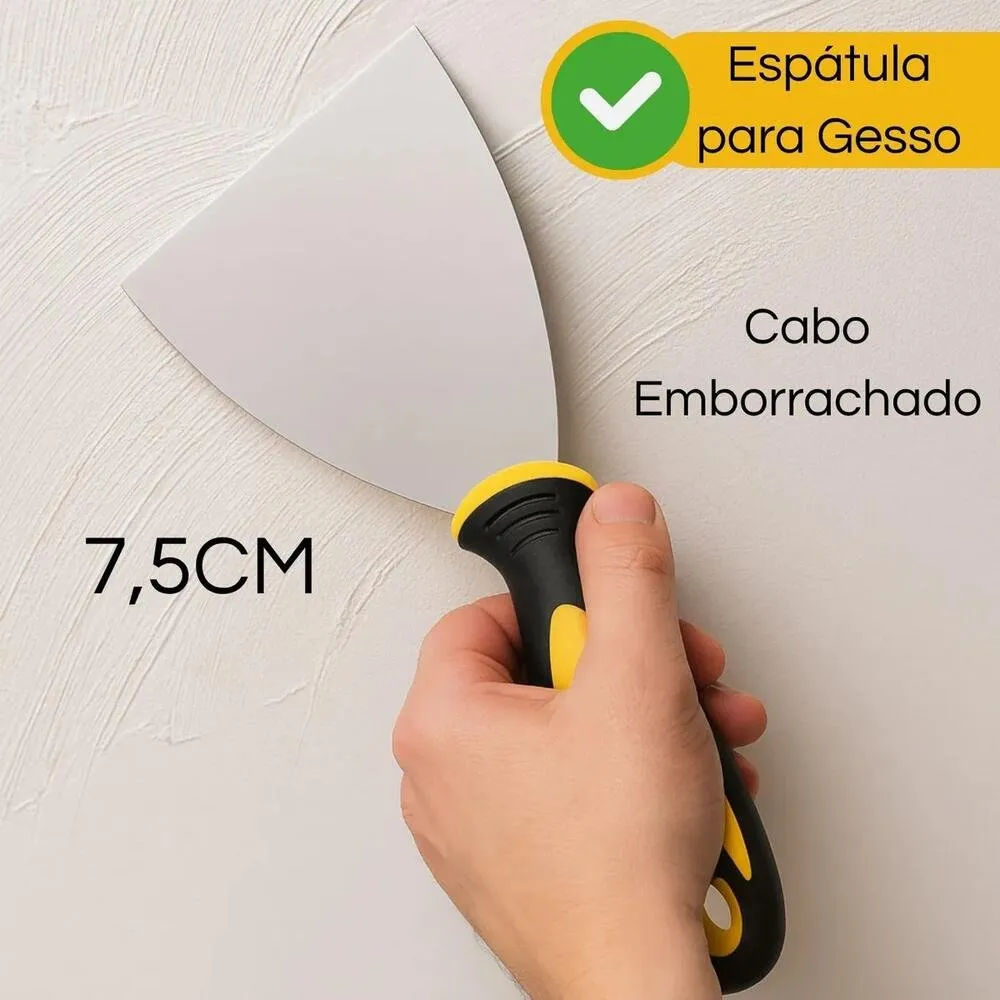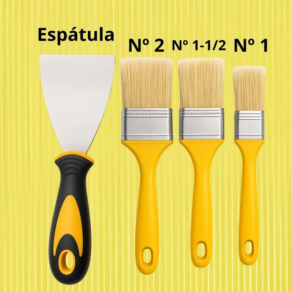 Composto por ferramentas versáteis, o kit permite realizar desde a aplicação de tinta até ajustes e acabamentos com maior precisão. As espátulas auxiliam na preparação e espalhamento de materiais, enquanto os pincéis são ideais para pintura em áreas menores e detalhes.