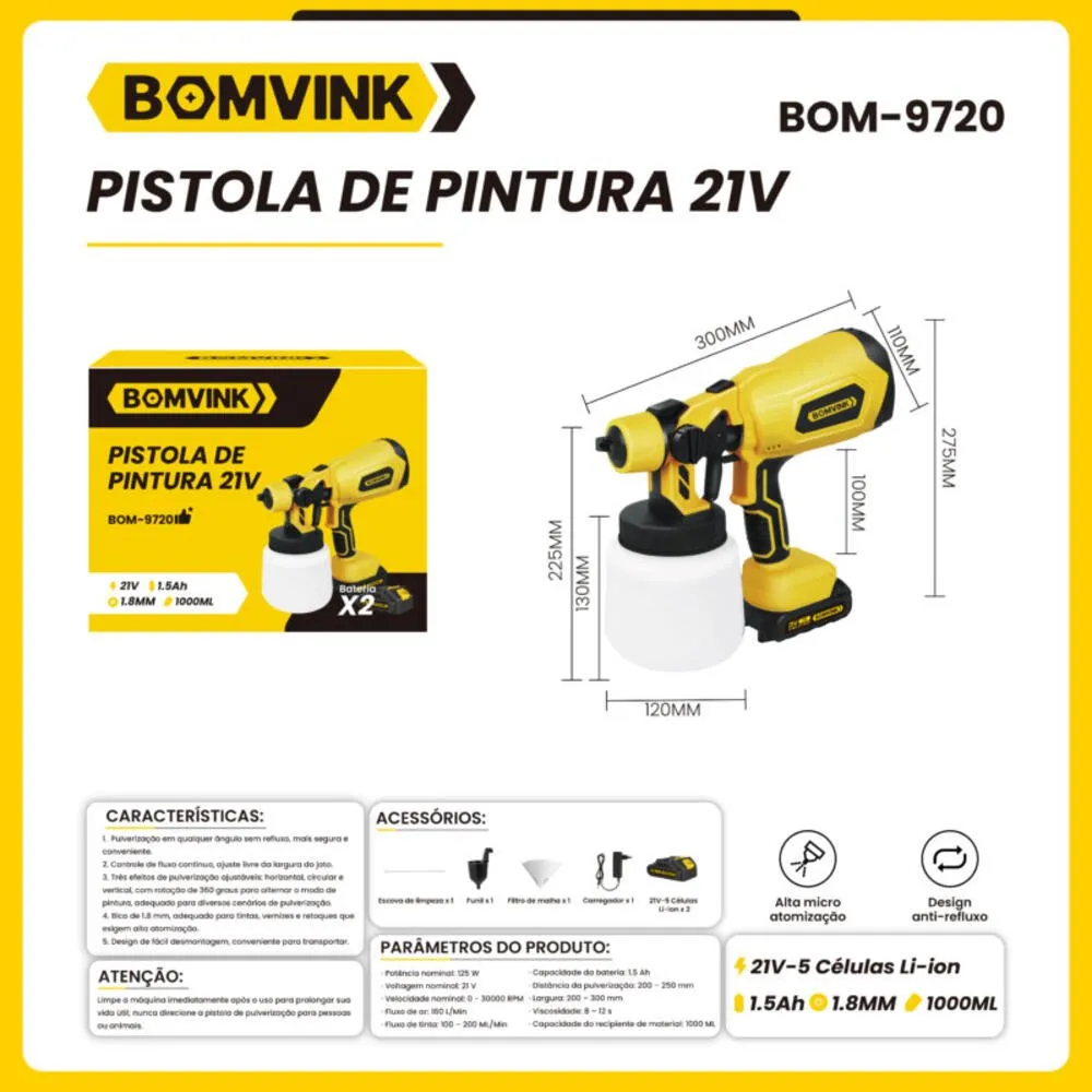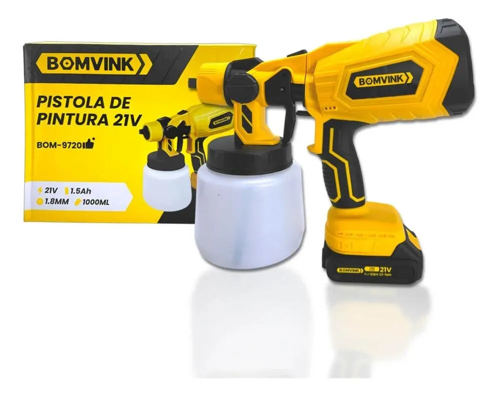 A Pistola de Pintura Elétrica Bomvink BOM-9720 é desenvolvida para aplicações de pintura em madeira, metal, paredes e diversos tipos de superfícies.