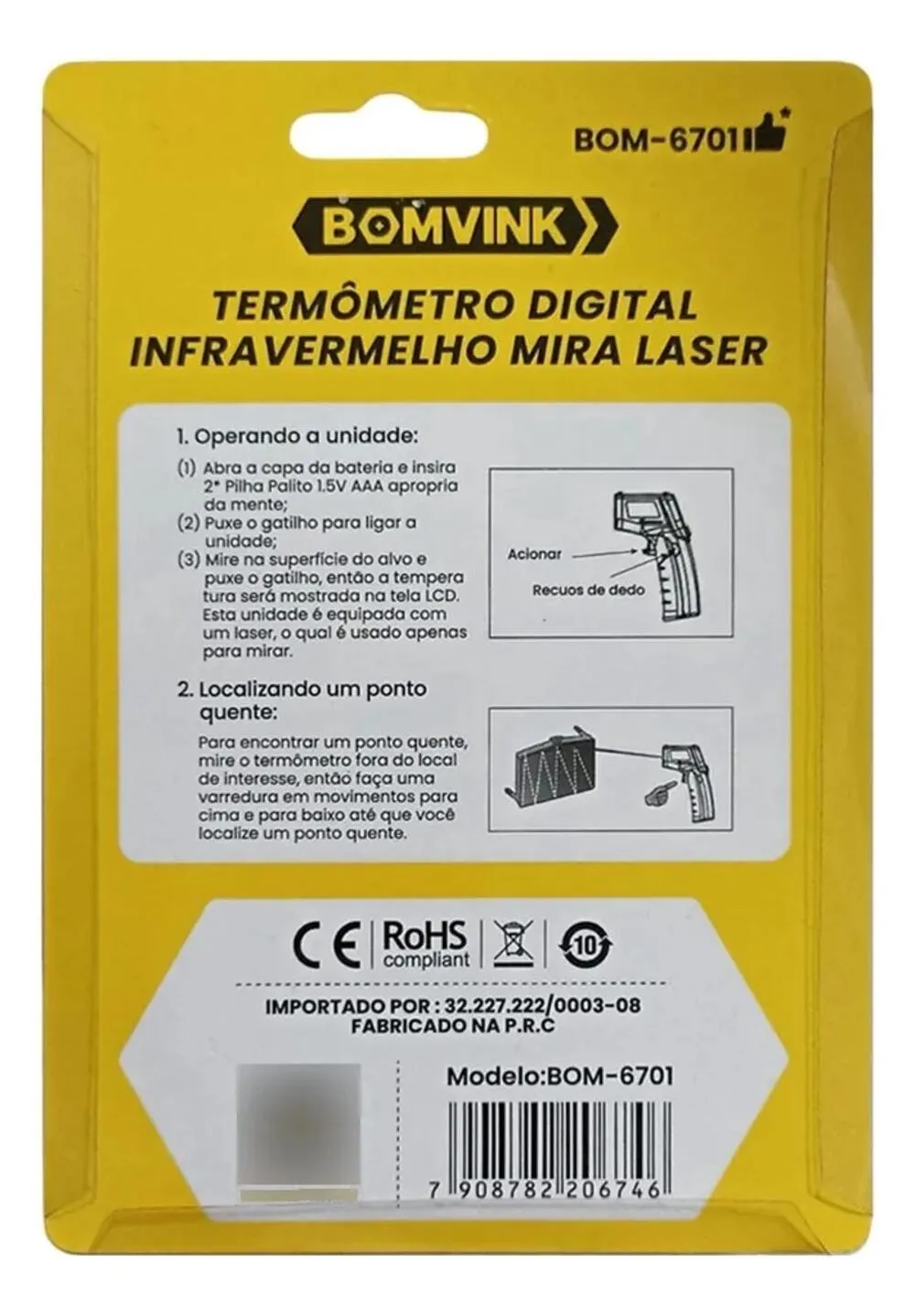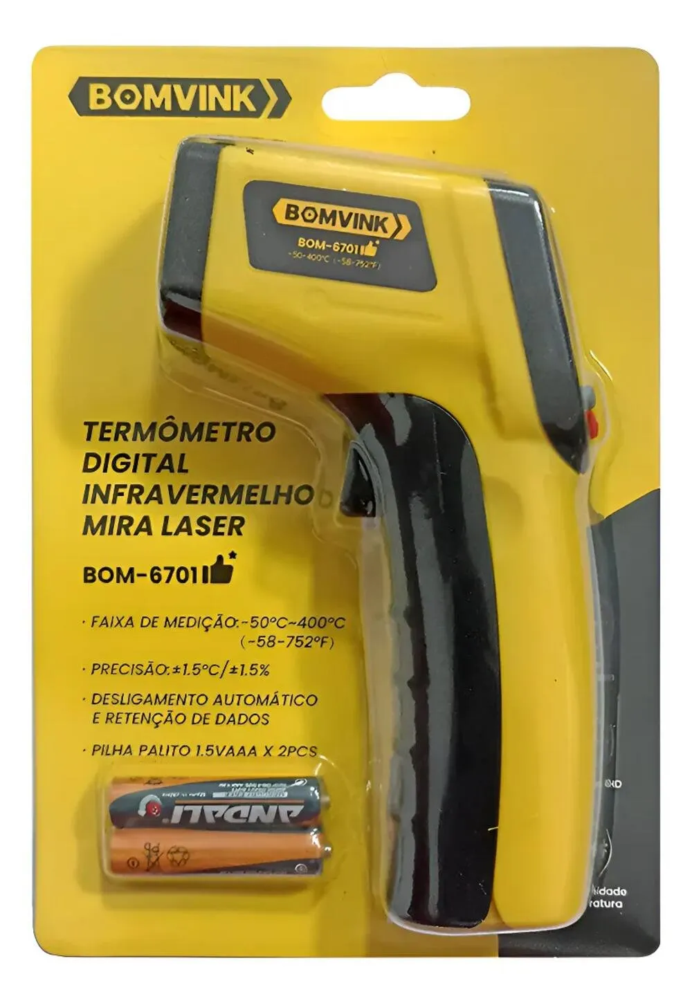 O Termômetro Infravermelho Bomvink BOM-6701 é indicado para medições de temperatura com segurança e praticidade, sem necessidade de contato direto com a superfície. Com ampla faixa de medição de -50°C a +400°C, é ideal para uso em manutenção industrial, automotiva, elétrica, refrigeração, climatização e inspeções técnicas em geral.