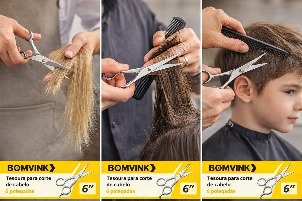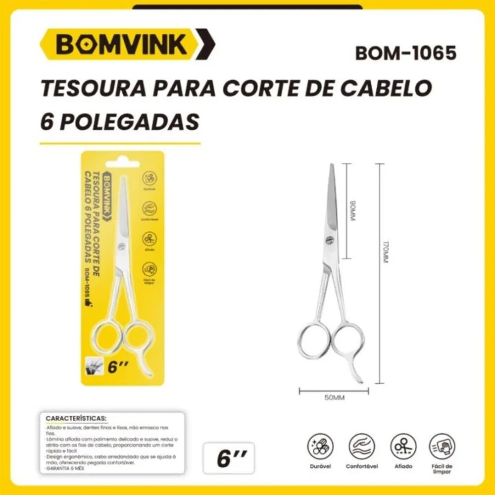 A Tesoura para Corte de Cabelo Bomvink BOM-1065 é uma ferramenta de barbearia desenvolvida para cortes precisos e confortáveis. Com 6 polegadas, oferece equilíbrio entre leveza e controle, sendo adequada para cortes gerais, desfiados leves e acabamentos.