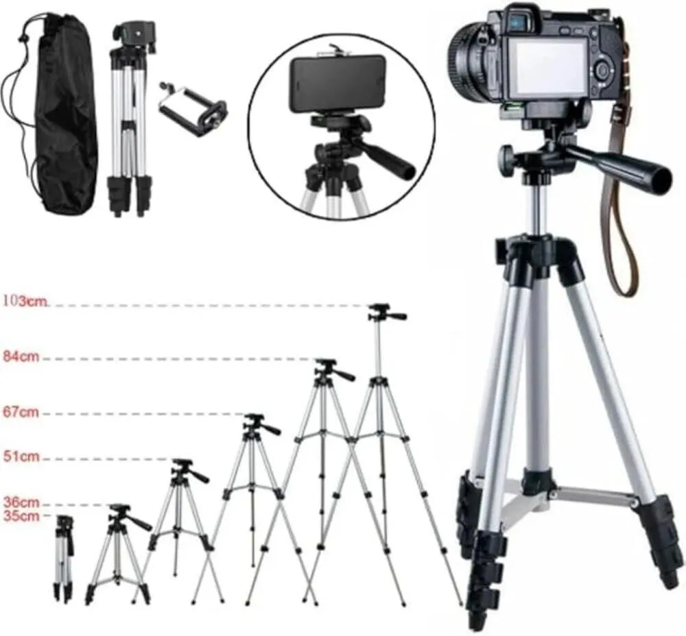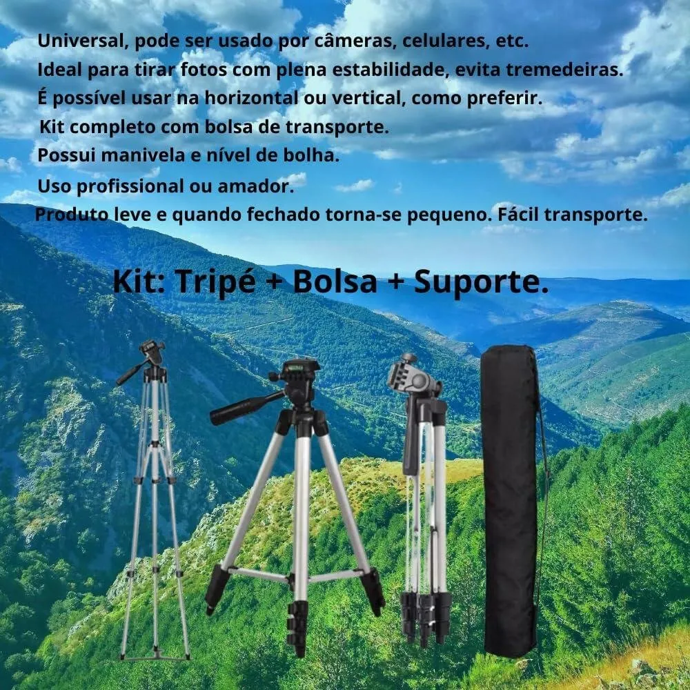 O Tripé Profissional Universal para Celular e Câmera 1,3m é ideal para fotos, vídeos, lives, chamadas de vídeo e gravações em geral. Fabricado em alumínio, é leve, resistente e fácil de transportar, acompanhando bolsa de transporte para maior praticidade.